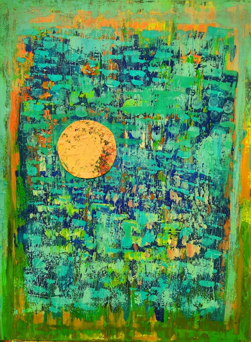 Monika Schiwy Yellow Moon Acryl auf Leinwand, Collage 80 x 60 cm signiert mit „MOS“